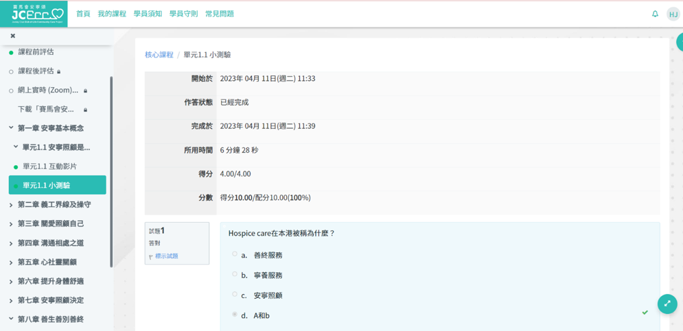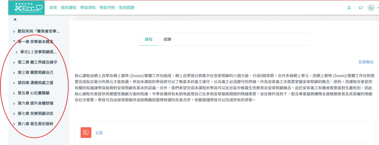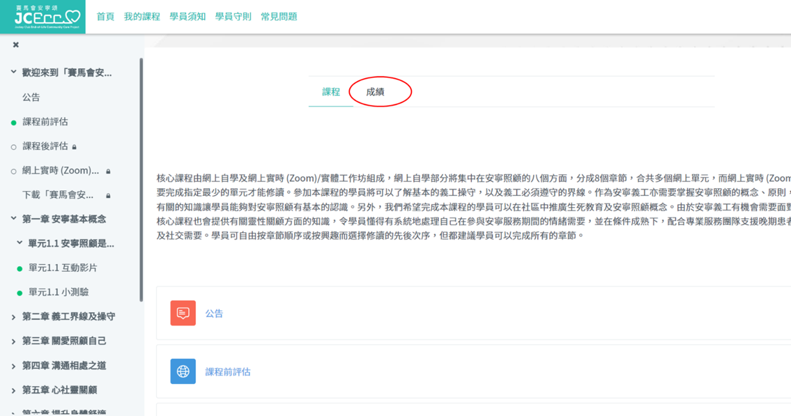 假若學員未有足夠條件獲取安寧義工核心課程證書,但有成功完成部份核心課程中的網上自學部份,您仍能在學習平台上透過成績功能看到您的課程完成進度。