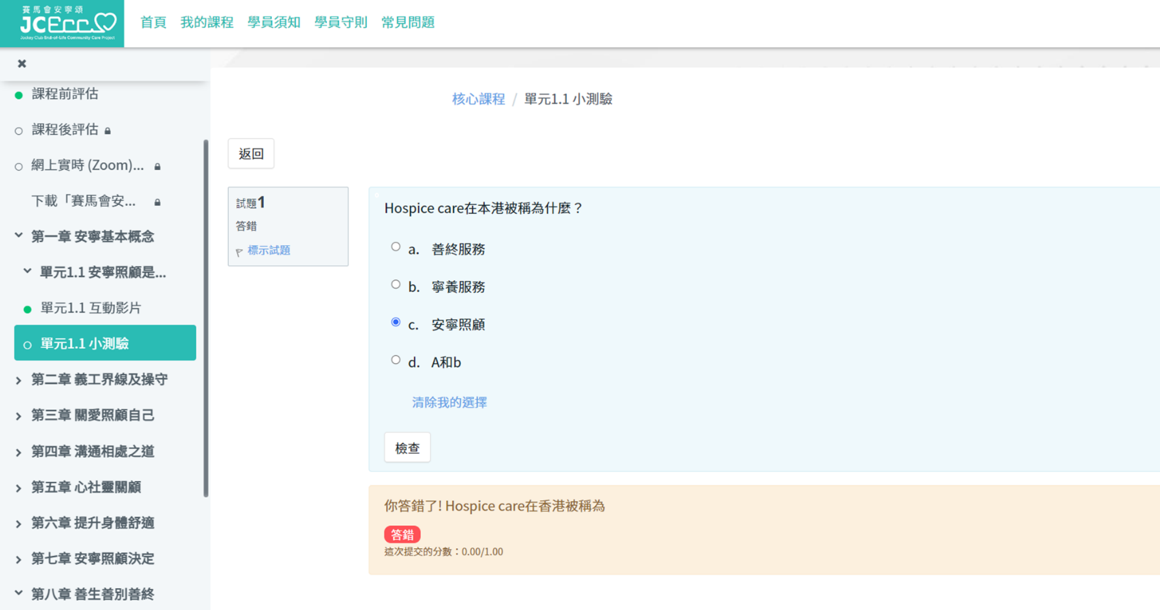 v.如檢查後發現答案不正確,正確的答案及解釋亦會即時提供。由於每條題目可以無限次作答,學員可即時修改自己錯誤的答案。