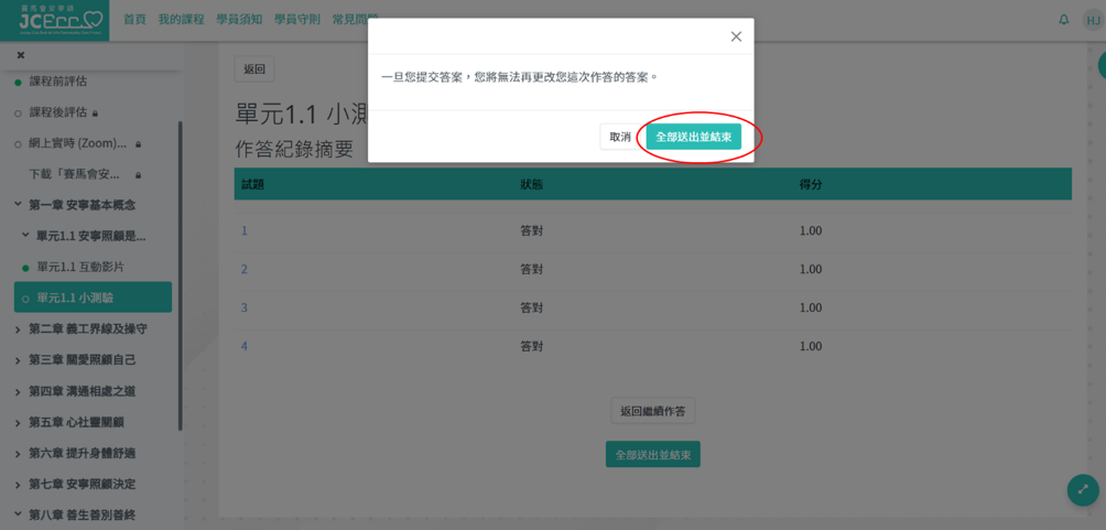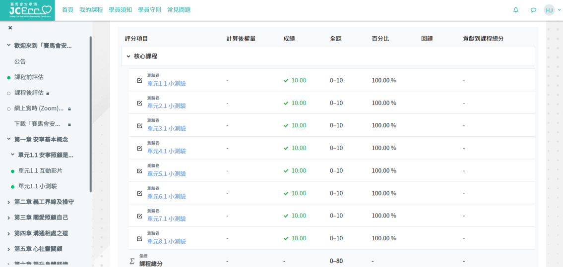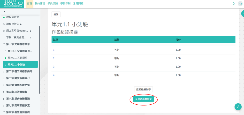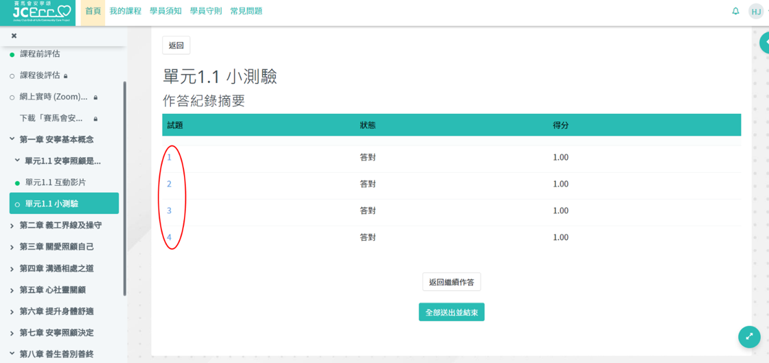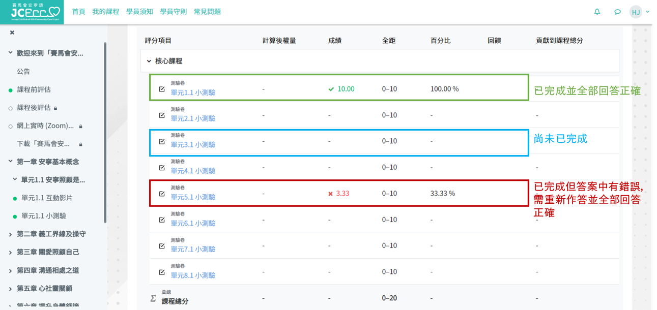 ix.若學員已遞交測驗,並答對所有問題,左面的章節欄中的單元小測驗的白點將會自動變成綠色