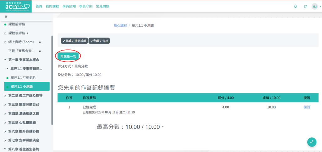 viii.即使測驗結果已遞交,學員仍然可以無限次作答及復習各單元的小測驗